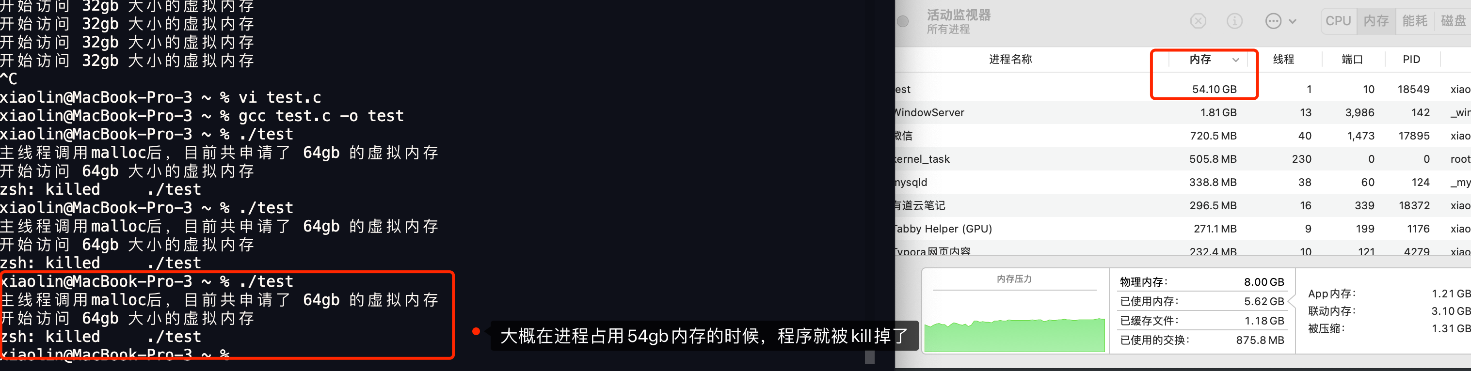当系统多次尝试回收内存,还是无法满足所需使用的内存大小,进程就会被系统 kill 掉了,意味着发生了 OOM(PS:我没有在 macos 系统找到像 linux 系统里的 /var/log/message 系统日志文件,所以无法通过查看日志确认是否发生了 OOM)。