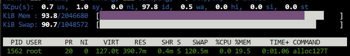 在 top 中我们可以看到这个申请了 127T 虚拟内存的进程。