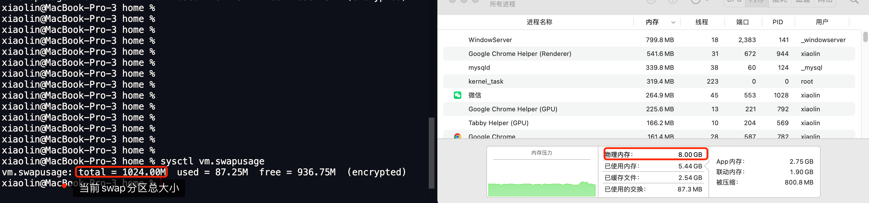 我用我的 mac book pro 笔记本做测试,我的笔记本是 64 位操作系统,物理内存是 8 GB,目前 Swap 分区大小为 1 GB(注意这个大小不是固定不变的,Swap 分区总大小是会动态变化的,当没有使用 Swap 分区时,Swap 分区总大小是 0;当使用了 Swap 分区,Swap 分区总大小会增加至 1 GB;当 Swap 分区已使用的大小超过 1 GB 时;Swap 分区总大小就会增加到至 2 GB;当 Swap 分区已使用的大小超过 2 GB 时;Swap 分区总大小就增加至 3GB,如此往复。这个估计是 macos 自己实现的,Linux 的分区则是固定大小的,Swap 分区不会根据使用情况而自动增长)。