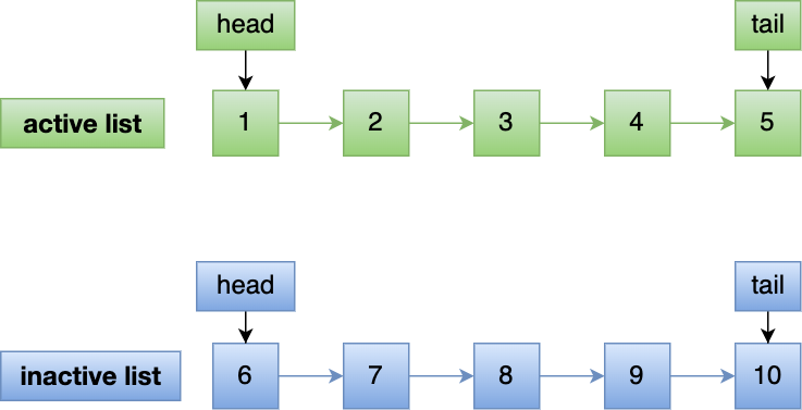 - Linux 操作系统实现两个了 LRU 链表:活跃 LRU 链表(active_list)和非活跃 LRU 链表(inactive_list);