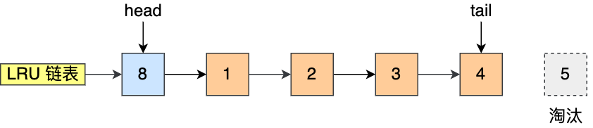 而如果接下来,访问了 8 号页,因为 8 号页不在内存里,且 LRU 链表长度为 5,所以必须要淘汰数据,以腾出内存空间来缓存 8 号页,于是就会淘汰末尾的 5 号页,然后再将 8 号页加入到头部。