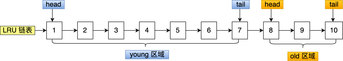 young 区域在 LRU 链表的前半部分,old 区域则是在后半部分,这两个区域都有各自的头和尾节点,如下图: