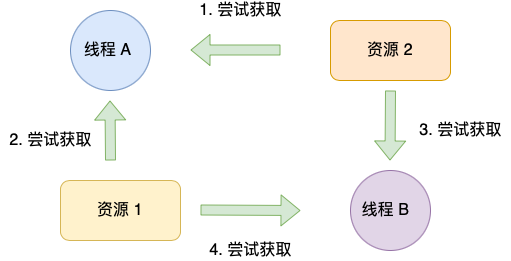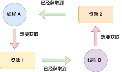 比如,线程 A 已经持有资源 2,而想请求资源 1,线程 B 已经获取了资源 1,而想请求资源 2,这就形成资源请求等待的环形图。